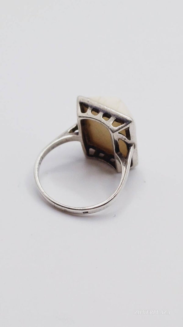 Ring met creme-kleurige steen. Gestempeld met 835. Maat 57. 5 gram.