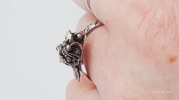 Prachtige aparte ring van een draak. De draak heeft een zwarte druppelvormige steen op zijn kop. Maat 62. Gestempeld met 925